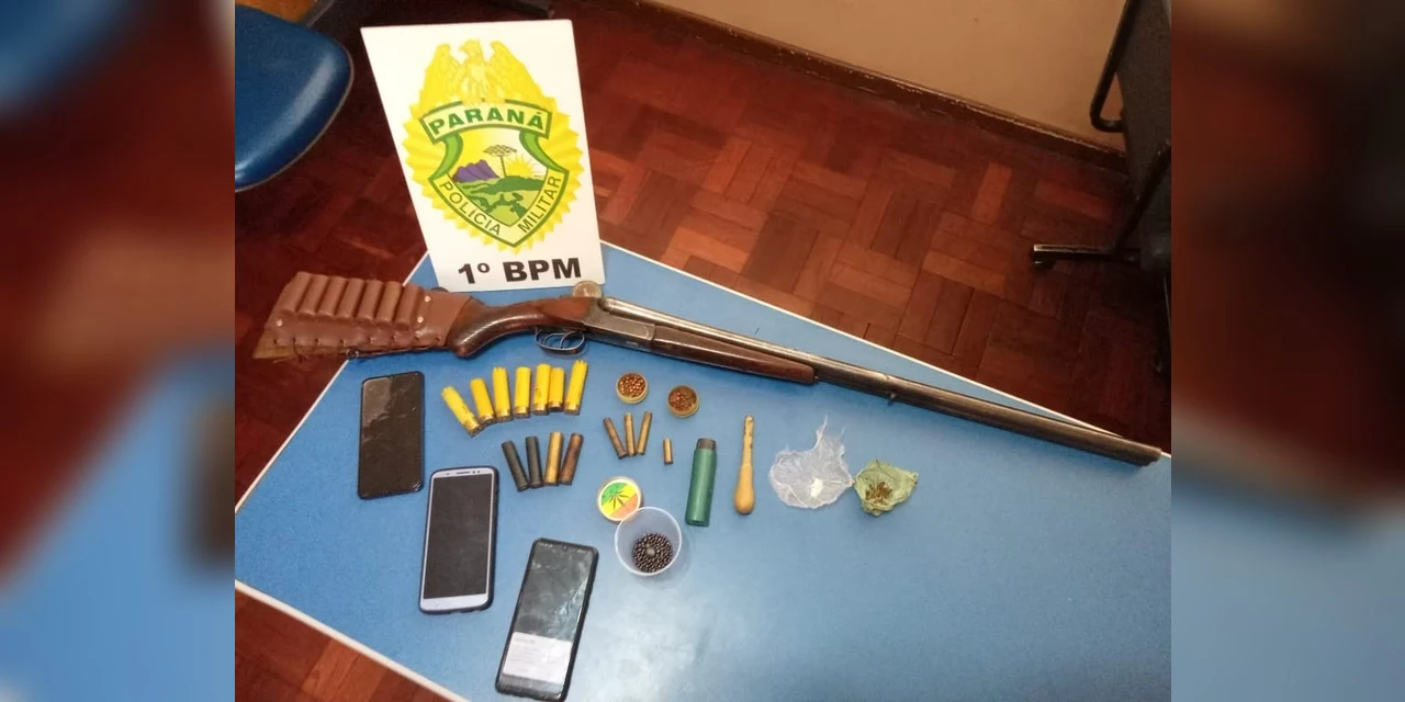 Uma pequena quantidade de drogas foi localizada, além de uma espingarda calibre 20. Dois adultos foram presos e um adolescente apreendido, alguns deles já com passagens pela polícia.