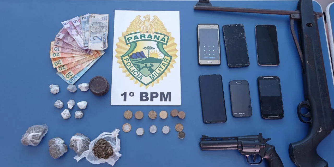 Invólucros de maconha foram encontrados com o dono da casa e com um dos abordados. Na residência a polícia localizou ainda um revólver calibre 38, munições, um simulacro (réplica) de arma de fogo e uma motocicleta sem placa de identificação, além de mais quatro porções da mesma droga.