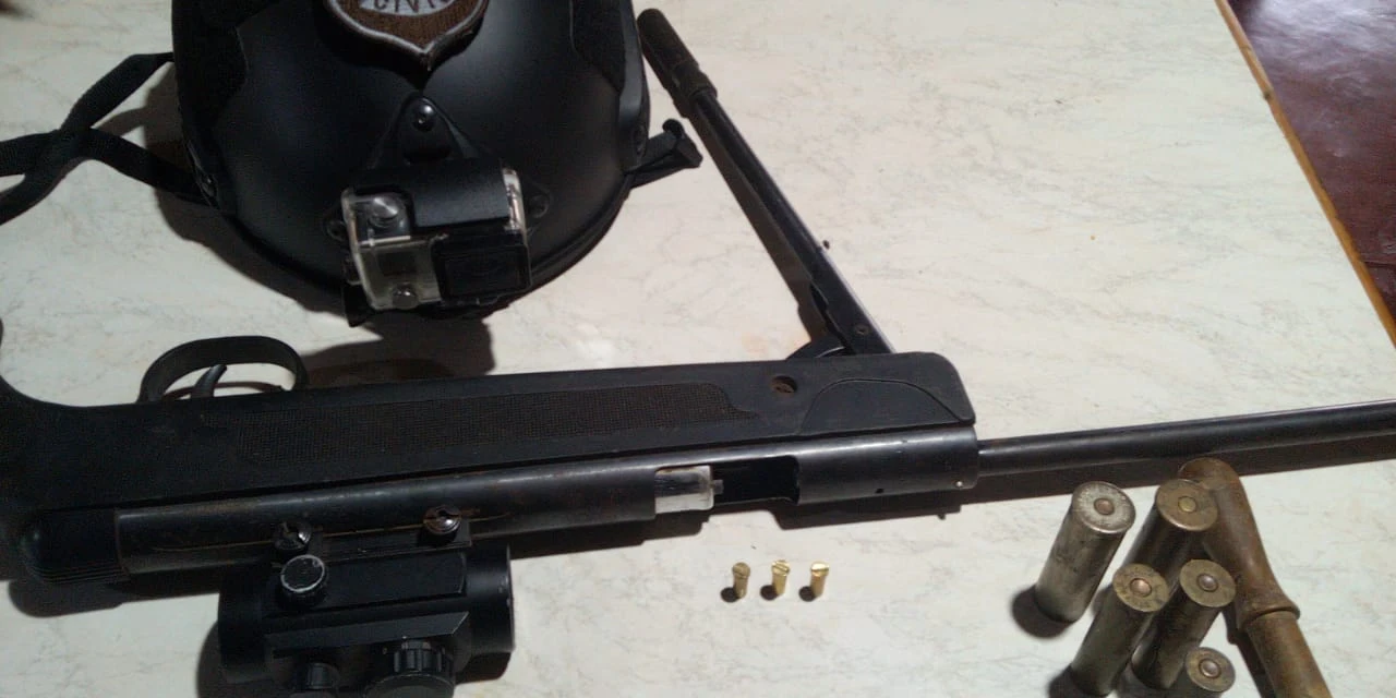 No endereço os investigadores localizaram uma espingarda de pressão adulterada para o calibre 22, bem como munições deflagradas do mesmo calibre. Foram encontradas também munições intactas dos calibres 12, 24 e 32.