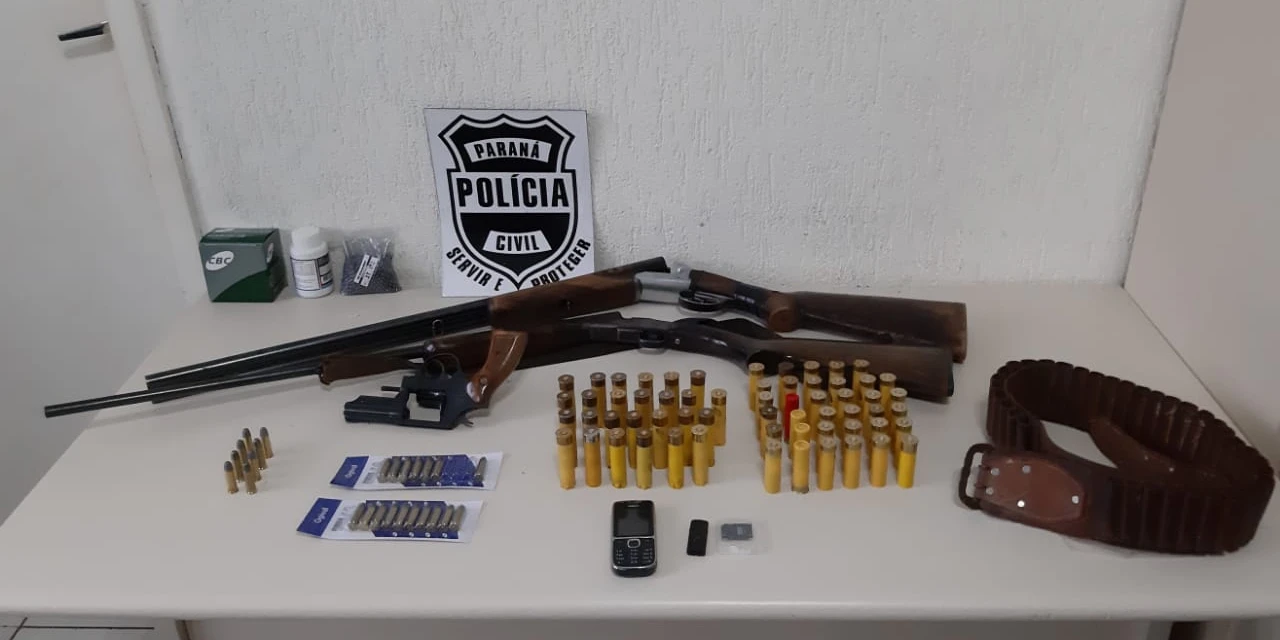Na ocasião do cumprimento do mandado, o investigado não foi localizado, porém os policiais encontraram armas e munições no local que foram aprendidos e serão encaminhados ao Juízo da Comarca local.