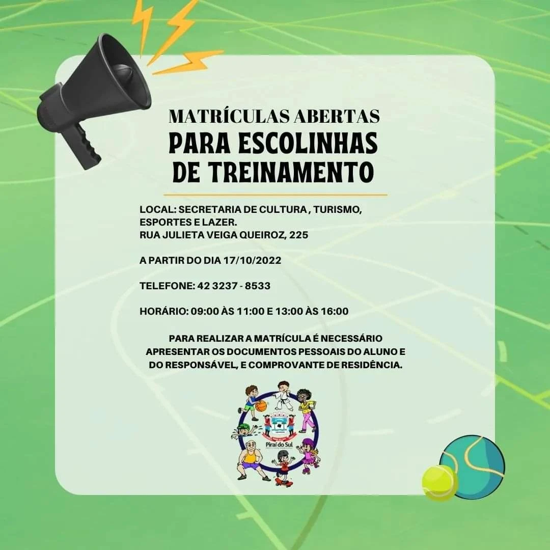 DA REDAÇÃO - Estão abertas desde a última segunda-feira, dia 17, as inscrições para as escolinhas de treinamento que serão ofertadas pela prefeitura de Piraí do Sul, através da secretaria municipal de Cultura, Turismo, Esportes e Lazer.