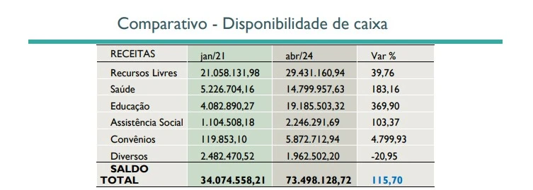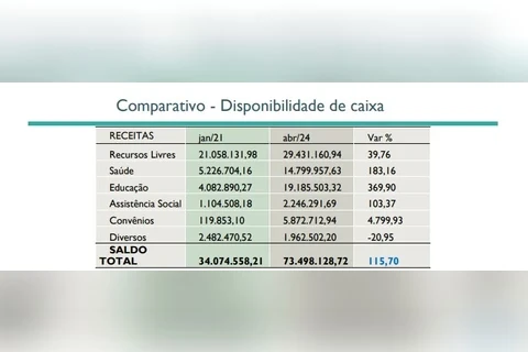 Com isso, o saldo total em caixa que era de R$ 34.074.558,21 em 2021 passou para R$ 73.498.128,72 no início de abril de 2024, valor que se traduz em inúmeros investimentos diretos, contrapartidas e projetos que beneficiam toda a população.