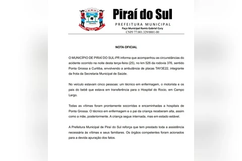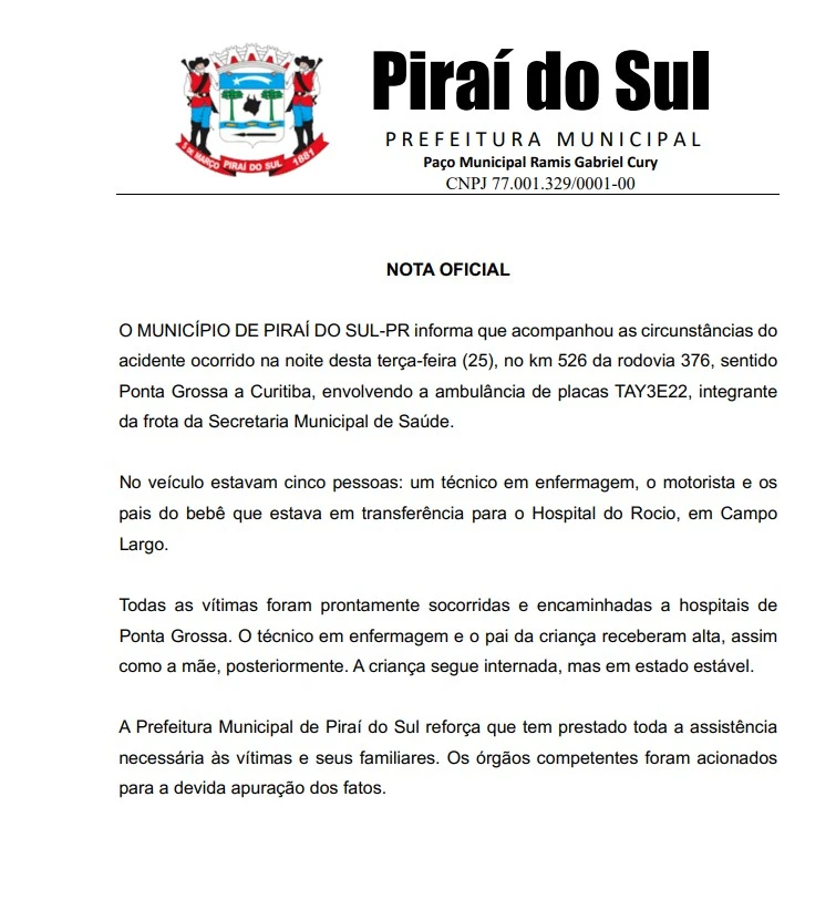 DA REDAÇÃO - Em nota enviada para a imprensa na manhã desta quinta-feira (27), a Prefeitura de Piraí do Sul se pronunciou oficialmente sobre o acidente que envolveu uma de suas ambulâncias na noite da última terça-feira (25), na BR 376, entre Ponta Grossa e Curitiba.