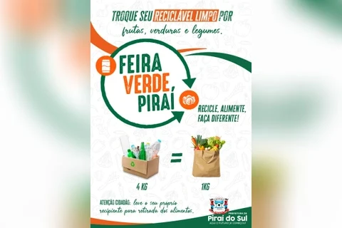 COM ASSESSORIAS - Apostando em medidas inovadoras e que garantam benefícios para a população, a prefeitura municipal lança neste mês o programa "Feira Verde Piraí", que tem suas primeiras coletas já agendadas para o próximo dia 31, às 9h30 no Alto da XV, em frente ao CMEI Cecília Born Alves, e às 14h30 no Campo de Futebol da Vila Dalcol.