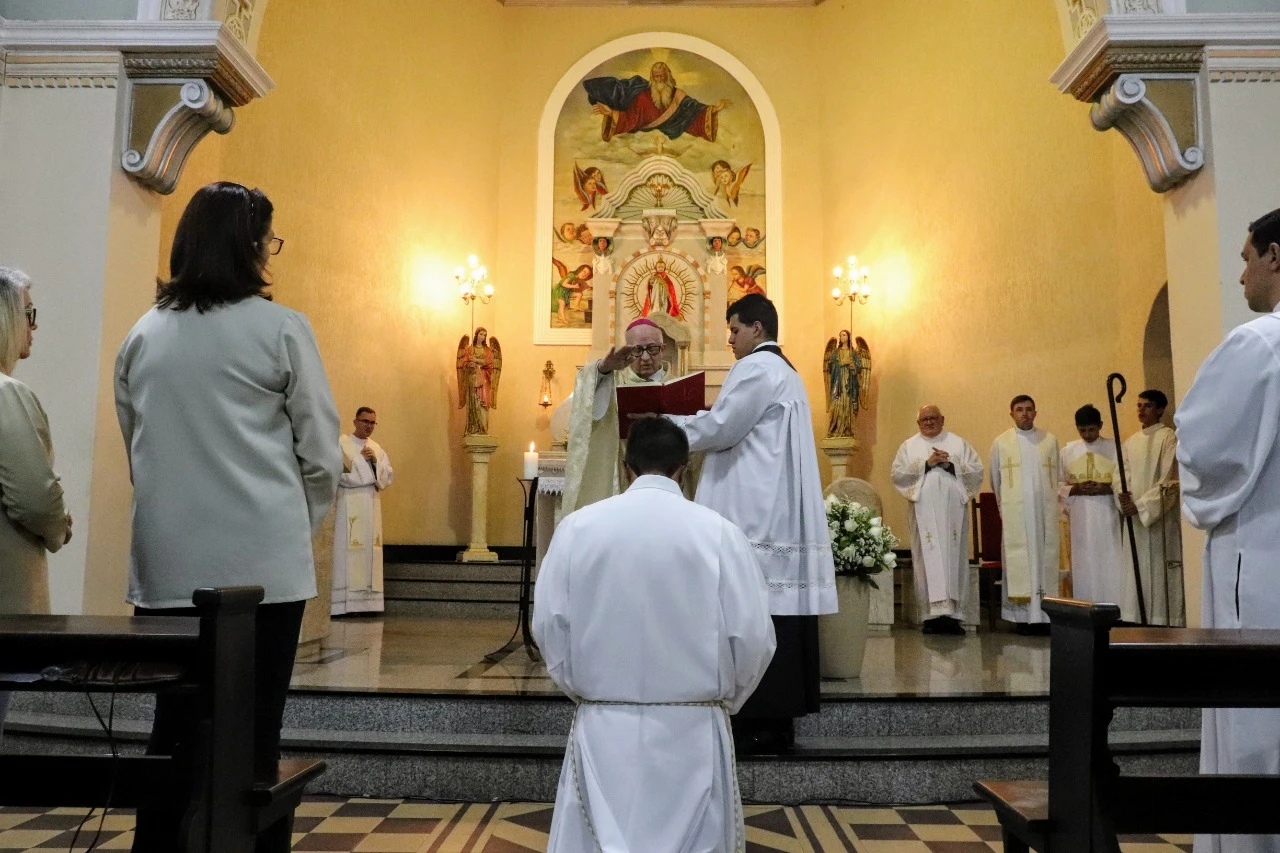 COM ASSESSORIAS - Junto às comemorações dos 144 anos da Paróquia Senhor Menino Deus, de Piraí do Sul, na sexta-feira (15), às 19 horas, foi celebrado o Rito de Admissão como candidato às Ordens Sacras do seminarista Antonio Carlos dos Santos Jr. A celebração, presidida pelo bispo Dom Sergio Arthur Braschi, ao lado dos padres Thiago Ingenchki, Roberval Mulhstedt, Rodrigo Ribas, Rafael Moreira e Sérgio Rocha, complementou a série de admissões prevista para este ano, que se iniciou em maio, quando quatro outros seminaristas foram aceitos: André Emanuel França, Jefferson Davi Sviercoski Sanchez, Gabriel Augusto Pereira Freytag e Iuri Nack Buss.