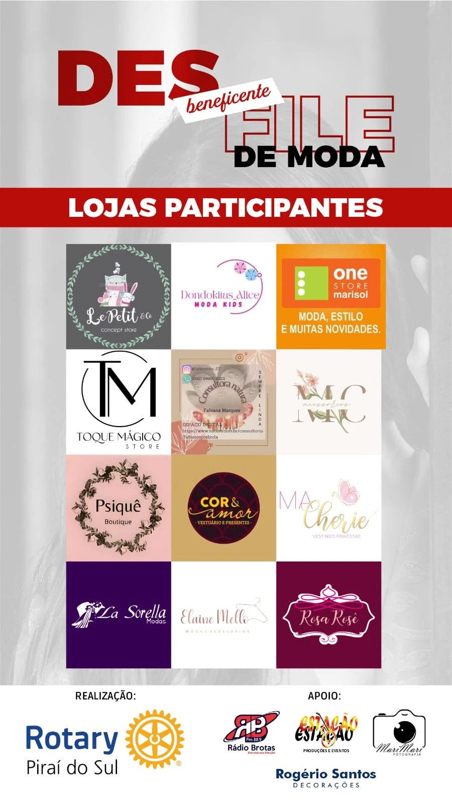 Parceiros - Participarão do evento as lojas Le Petit Concept Store, Dondokitas Alice Moda Kids, Toque Mágico Store, One Store Marisol, MC Acessórios, Psiquê Boutique, Cor & Amor, MA Cherie, La Sorella Modas, Elaine Mello Moda & Acessórios e Rosa Rosê, além da consultora Natura Fabiana Marques, da loja Sempre Linda.