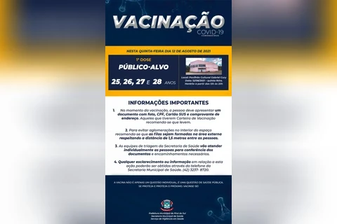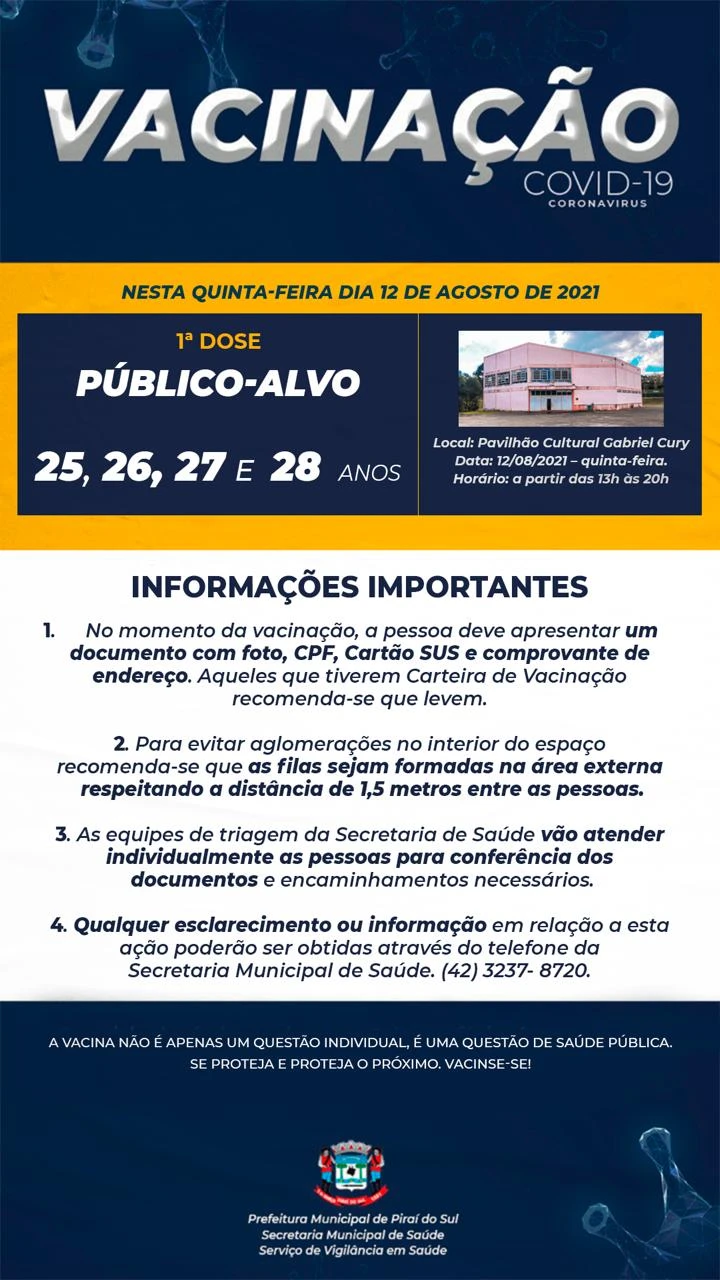 A REDAÇÃO – Acontece na próxima quinta-feira, dia 12, em Piraí do Sul, mais uma etapa da vacinação de primeira dose contra a Covid-19, dessa vez para pessoas com idade entre 25 e 28 anos.