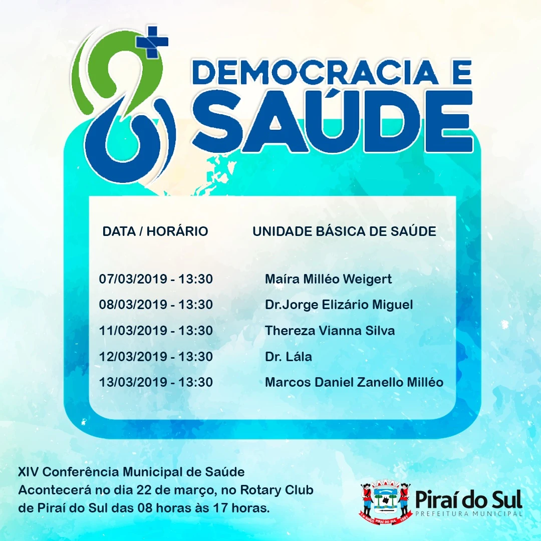 Lembrando que a XIV Conferência Municipal de Saúde acontece no dia 22 de março, no Rotary Club de Piraí do Sul das 08 horas às 17 horas.