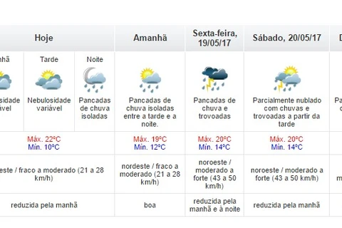 Na sexta-feira, 19, o volume de chuvas deve aumentar, inclusive com a incidência de trovoadas. O sábado e o domingo terão tempo parcialmente nublado, com chuvas e trovoadas ao longo dos dois dias.