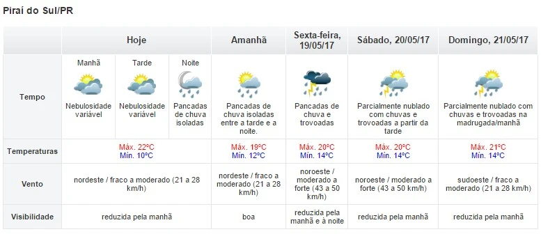 Segundo o Simepar (Sistema Meteorológico do Paraná), inicia nesta quarta-feira, 17, um período de chuvas em Piraí do Sul que deve durar, a princípio, até o domingo, dia 21.