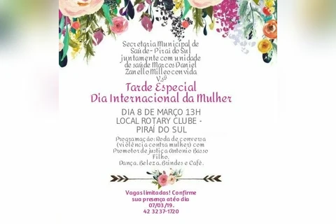 Toninho Anhaia - A Prefeitura Municipal juntamente com a Secretaria de Saúde e a UBS Marcos Daniel Zanello Milléo convidam as mulheres da área de abrangência da unidade para uma tarde especial na próxima sexta-feira, 08, no Rotary Club de Piraí do Sul a partir das 13 horas.