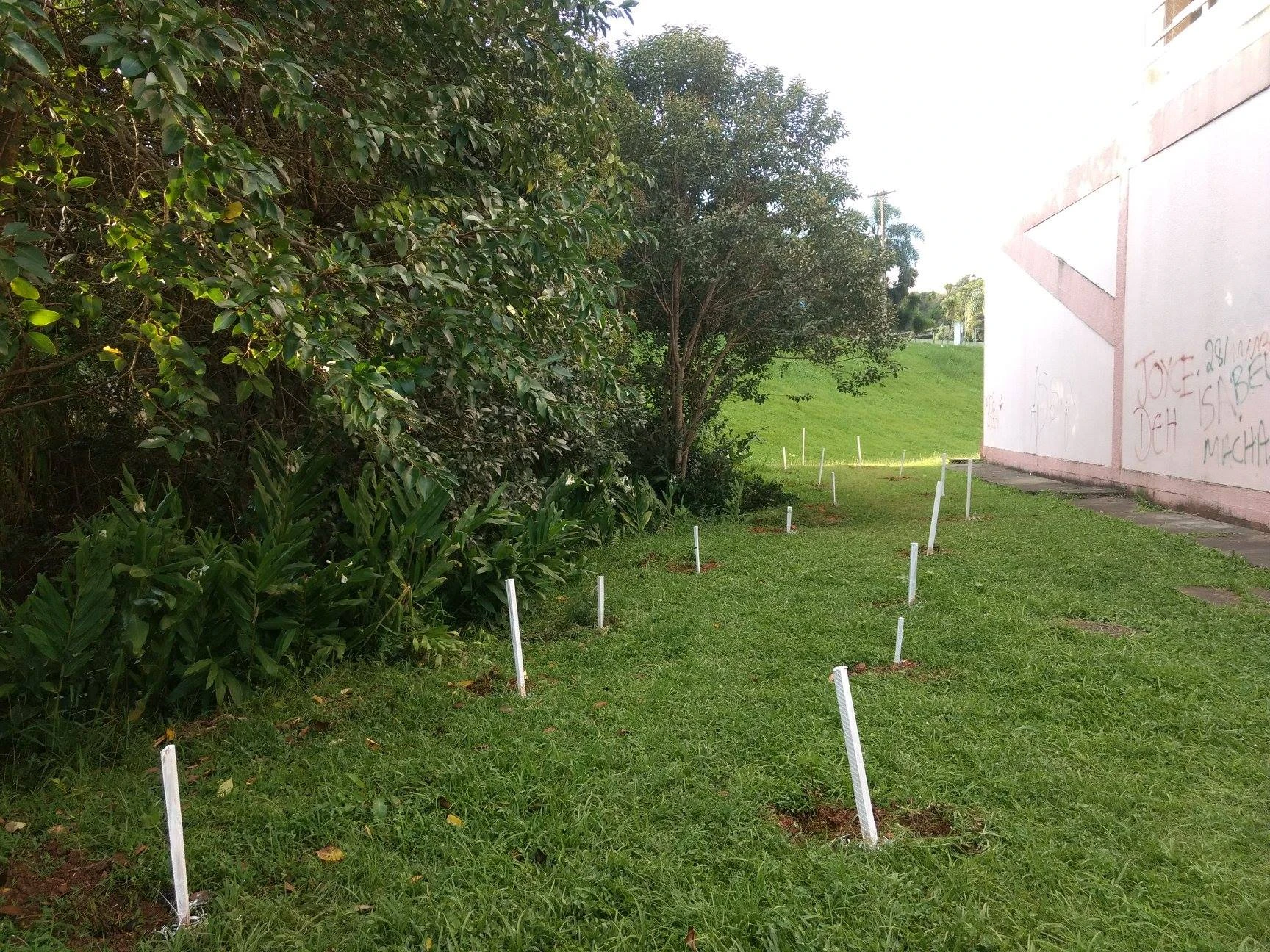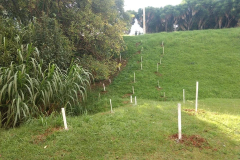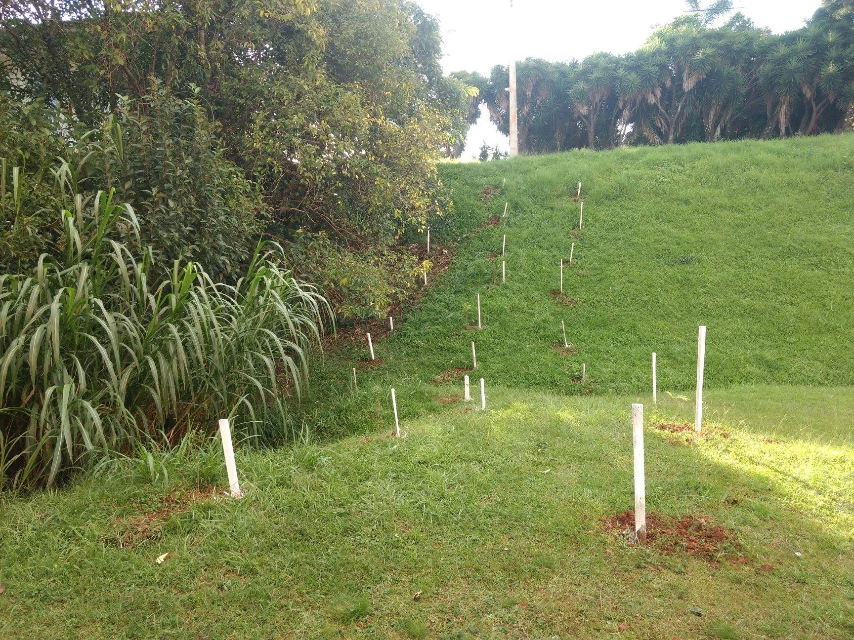 Para facilitar a identificação dos pontos de plantio, os voluntários demarcaram a região com estacas brancas. Essa medida visa contribuir para que as pessoas que trabalham na limpeza do local saibam exatamente onde as mudas estão.