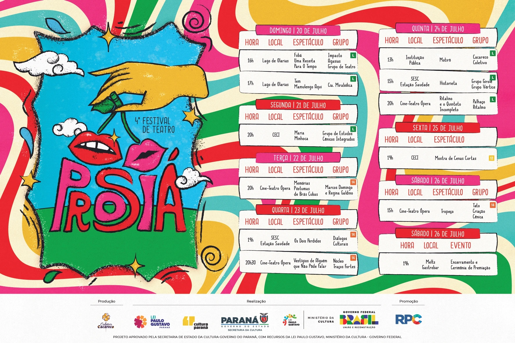 A quarta edição do Festival de Teatro Prosiá é realizada com apoio do Governo do Estado do Paraná, por meio da Lei Paulo Gustavo, via Secretaria de Estado da Cultura, com recursos do Ministério da Cultura – Governo Federal.