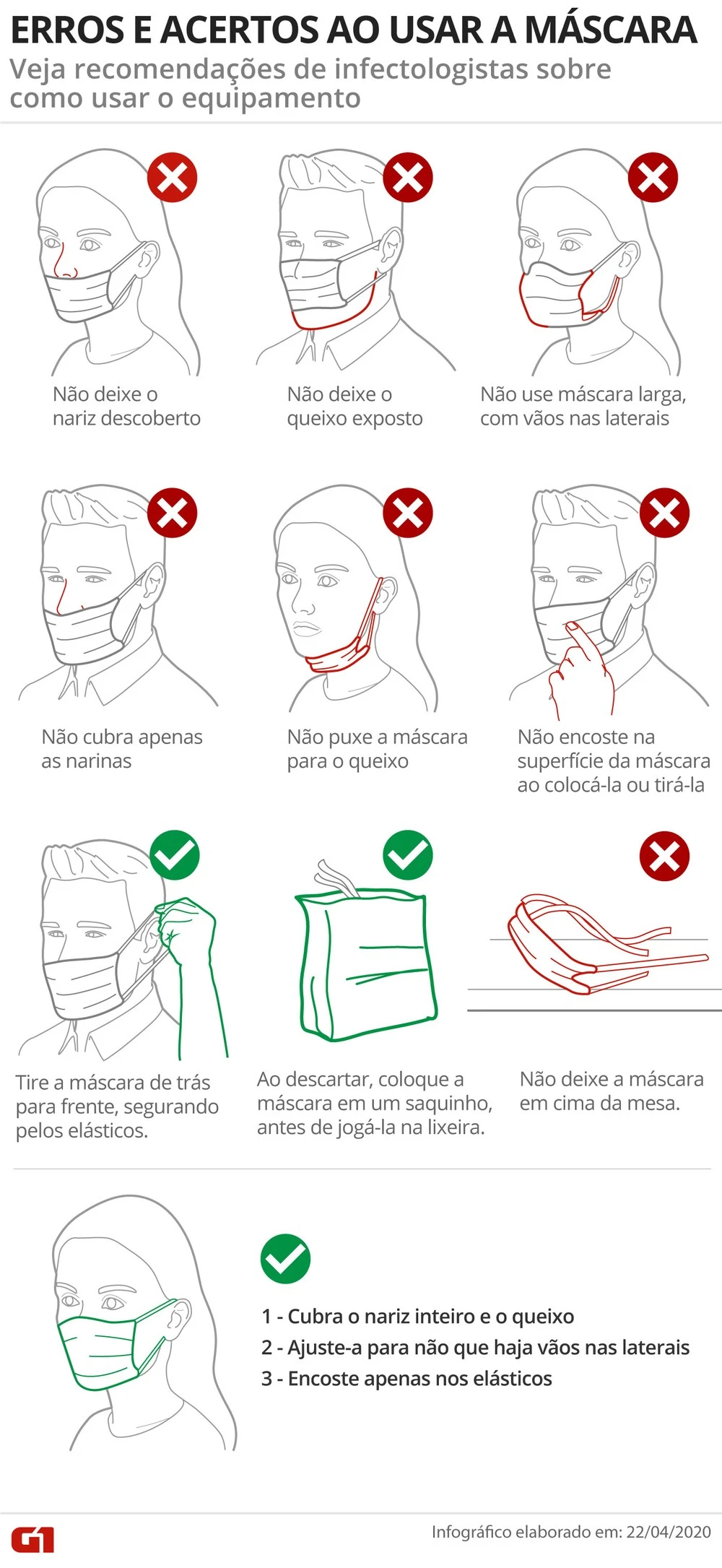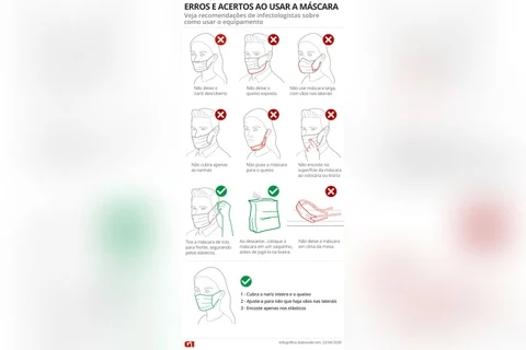 É importante que todos usem a máscara da forma correta: cobrindo completamente o nariz e a boca, sem vãos laterais. Segundo infectologistas ouvidos pelo G1, manusear ou descartar o equipamento da forma errada pode aumentar o risco de contaminação.