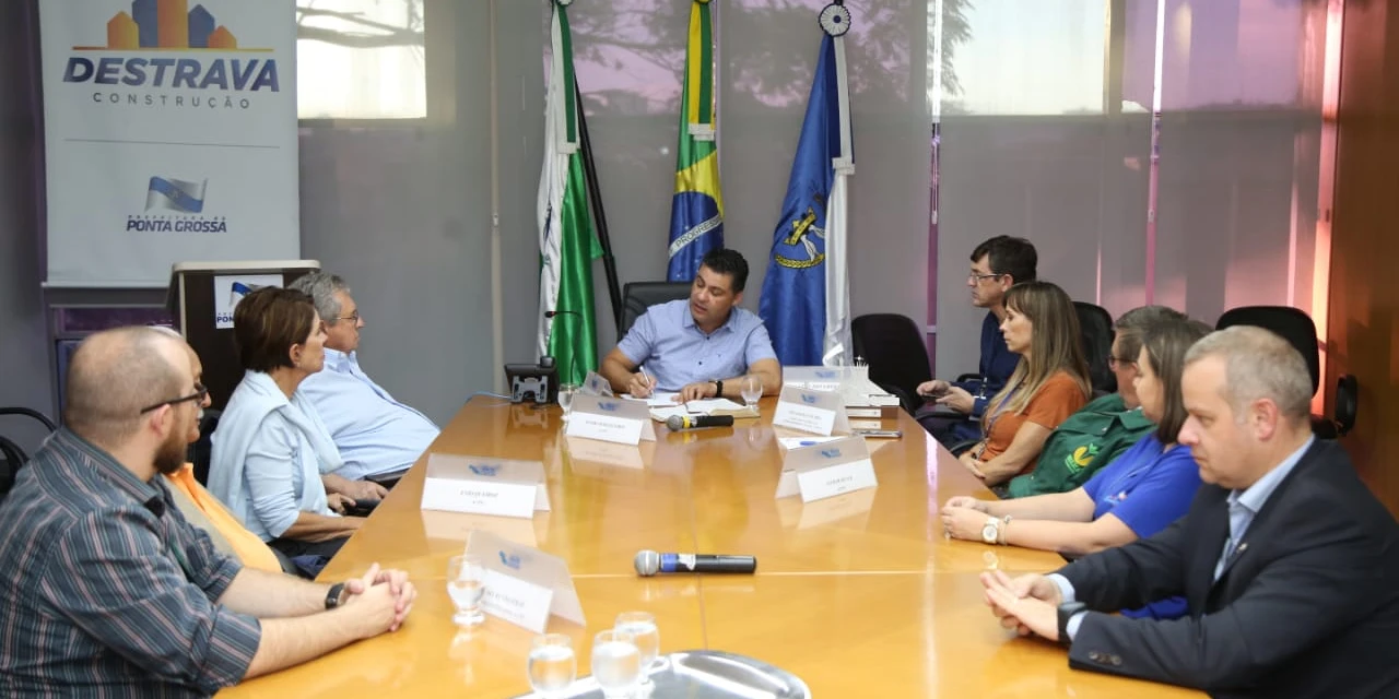 COM ASSESSORIAS - O presidente da Associação Comercial, Industrial e Empresarial de Ponta Grossa, Douglas Taques Fonseca, acompanhado da diretora de Responsabilidade Social, Sandra Queiroz, estiveram na última quinta-feira (13) com o prefeito Marcelo Rangel (PSDB), com o secretário da Fazenda, Cláudio Grokoviski, a coordenadora de Fomento ao Empreendedorismo e Inovação, Tônia Mansani e representantes da equipe da Sala do Empreendedor para parabeniza-lo pelo fato do Município ter sido contemplado no X Prêmio Prefeito Empreendedor, na categoria "Políticas Públicas para o Desenvolvimento dos Pequenos Negócios", regional Sul, do Sebrae.