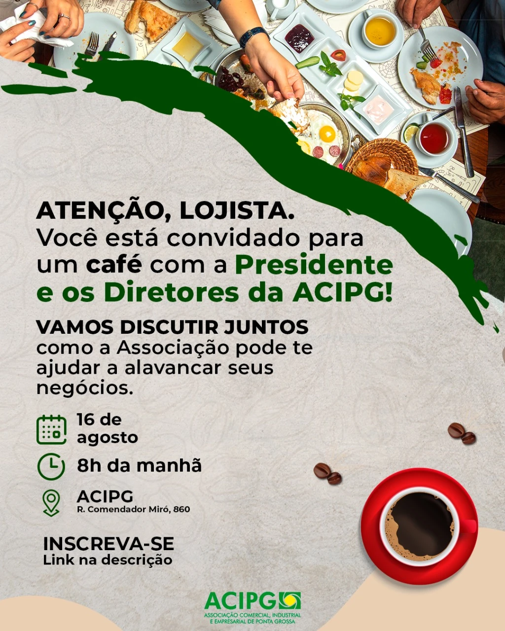 O Café da Manhã da ACIPG é voltado para todos os comerciantes de Ponta Grossa, para participar basta fazer a inscrição no