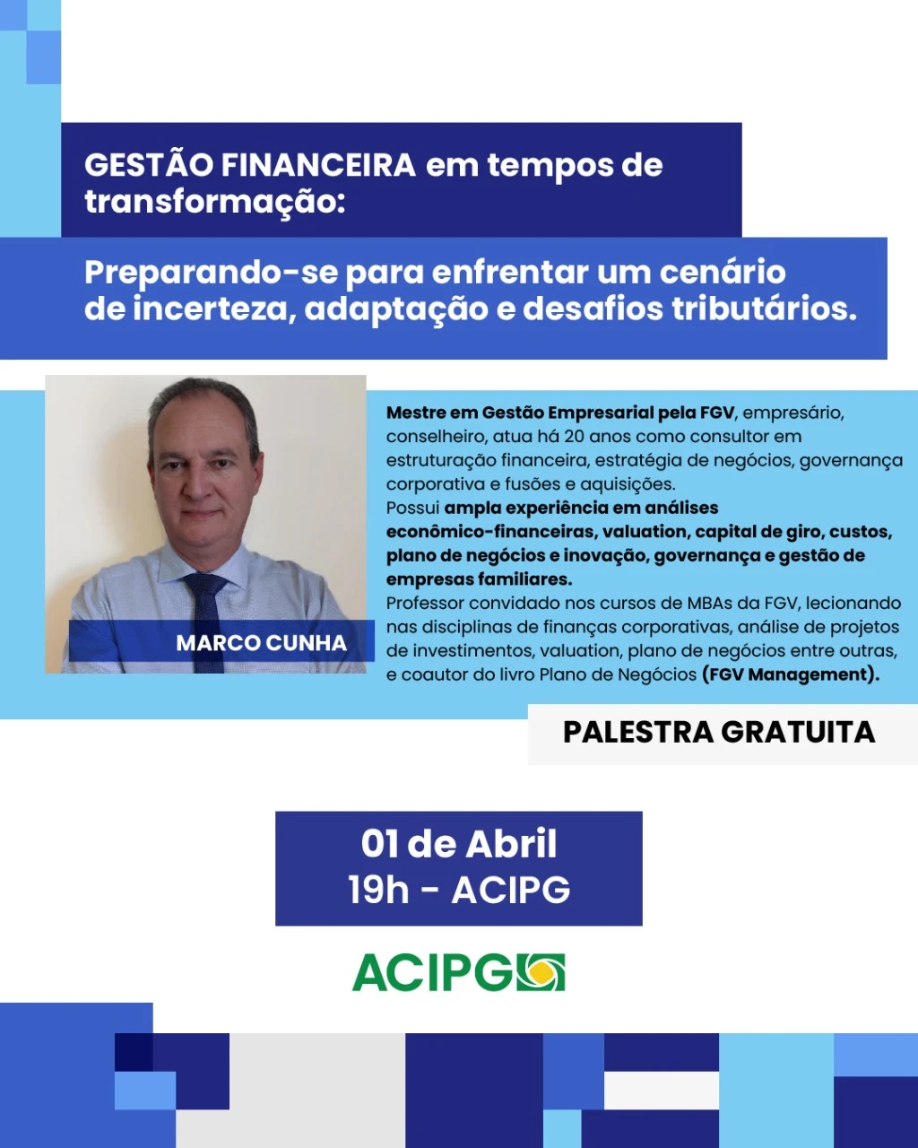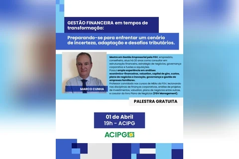 COM ASSESSORIAS - A Associação Comercial, Industrial e Empresarial de Ponta Grossa (ACIPG) convida empresários, gestores e o público em geral para a palestra "Gestão Financeira em Tempos de Transformação", que será ministrada pelo renomado especialista Marco Cunha. O evento acontecerá no dia 01 de abril de 2025, das 19 às 21 horas, com inscrições gratuitas para associados.