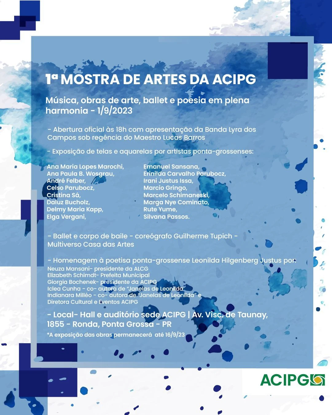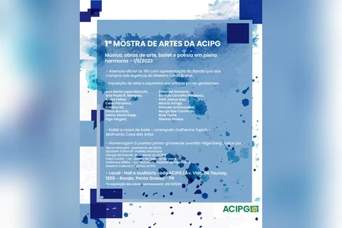 A Mostra de artes contemplará artistas locais da pintura, dança e poesia, e a cerimônia de abertura para o público terá apresentação da Banda Lyra dos Campos, seguida a apresentação das telas e aquarelas por artistas plásticos ponta-grossenses, sob a curadoria de Celso Parubocz. Na sequência haverá números de ballet clássico pelo coreógrafo Guilherme Tupich e para finalizar, homenagem à poetisa Leonilda Hilgenberg Justus pela presidente da Academia de Letras dos Campos Gerais, com interpretações de suas poesias pela prefeita Elizabeth Schimdt, pela Presidente da ACIPG Giorgia Bocheneck, pelas coautoras do livro "Janelas de Leonilda", Iclea Cunha, e da Diretora de Eventos e Cultura da ACIPG, Indianara Prestes Mattar Milléo.
