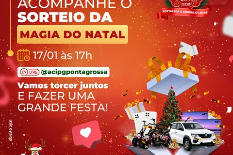 COM ASSESSORIAS - A Associação Comercial, Industrial e Empresarial de Ponta Grossa (ACIPG) realiza na próxima segunda-feira (17), às 17 horas, o sorteio dos vencedores da Campanha "Magia do Natal", quando serão conhecidos os ganhadores de mais de R$ 80 mil em prêmios.