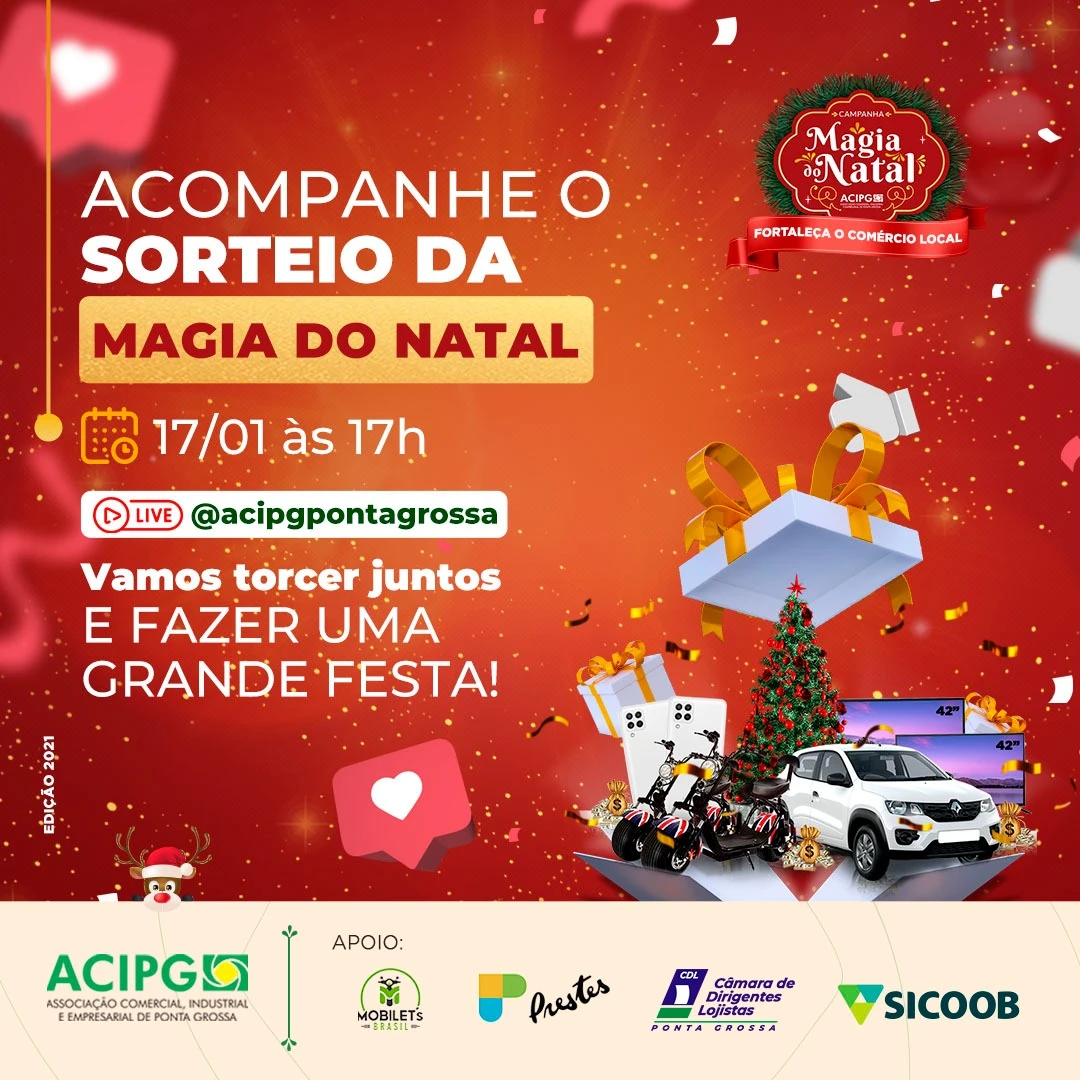 A "Magia de Natal" da ACIPG vai sortear um carro 0 km ou R$ 60 mil em poupança, além de mobiletes elétricas, smartphones e TVs de 42 polegadas. Concorrem aos prêmios consumidores que fizeram compras com valor superior a R$ 50 nas lojas locais participantes da campanha,