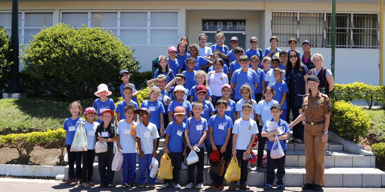 COMUNICAÇÃO/1°BPM - Na tarde desta segunda-feira (27), 43 alunos da Escola Municipal Professora Marta Filipkowski de Lima visitaram a Sede do 1º Batalhão de Polícia Militar, no Bairro da Ronda.