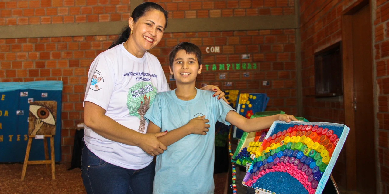 Ela destacou a obra do menino Leonardo Paglio da Silva, 10 anos, que está no 3º ano do Ensino Fundamental e realizou um quadro contendo um arco-íris feito a partir de tampas de garrafa multicoloridas. Através da Língua de Sinais, ele disse que escolheu o arco-íris devido ao seu encanto pelas cores. Sua fala, traduzida pela professora Luciane Selski Portela, mostra seu grande poder descritivo e de observação. “Toda vez que chove eu saio para procurar o arco-íris, que se forma quando o sol passa pelas gotas de chuva. Eu também o encontro nas poças d’água que se formam quando chove e fico encantado com os tamanhos e a quantidade de cores que existem neles”, conta o menino.