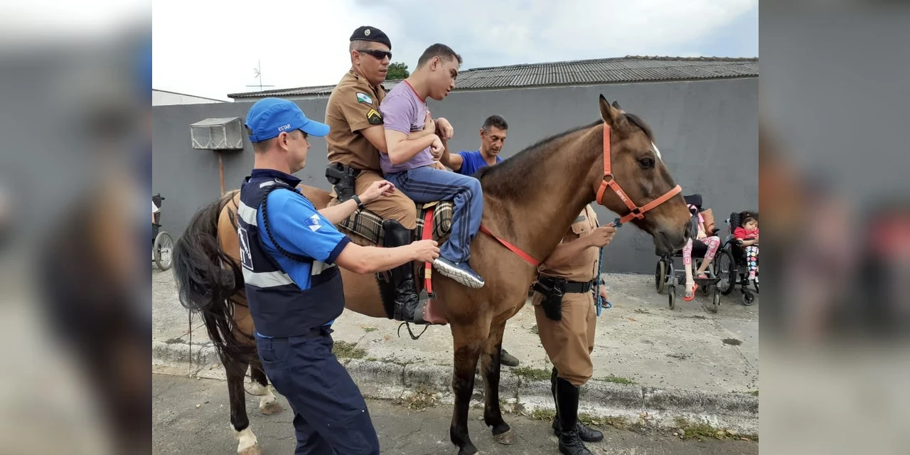 COM ASSESSORIAS - Hoje (07), foi um dia mais especial para as crianças atendidas pela Associação Pontagrossense de Assistência a Criança com Deficiência - APACD. Equipes da Cavalaria do 1º Batalhão de Polícia Militar visitaram a Instituição.