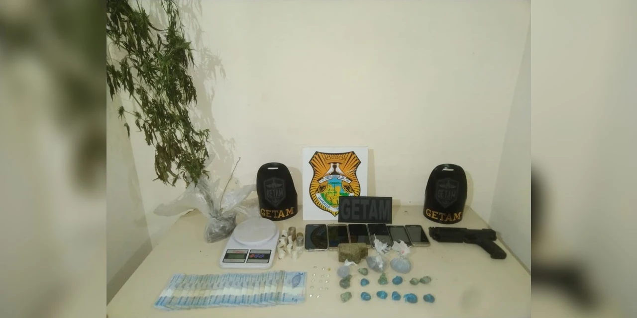 Dentro da sacola, os guardas encontraram 200 gramas de maconha e dentro da residência foi localizado mais maconha e crack, além dois pés de maconha e um simulacro de arma.