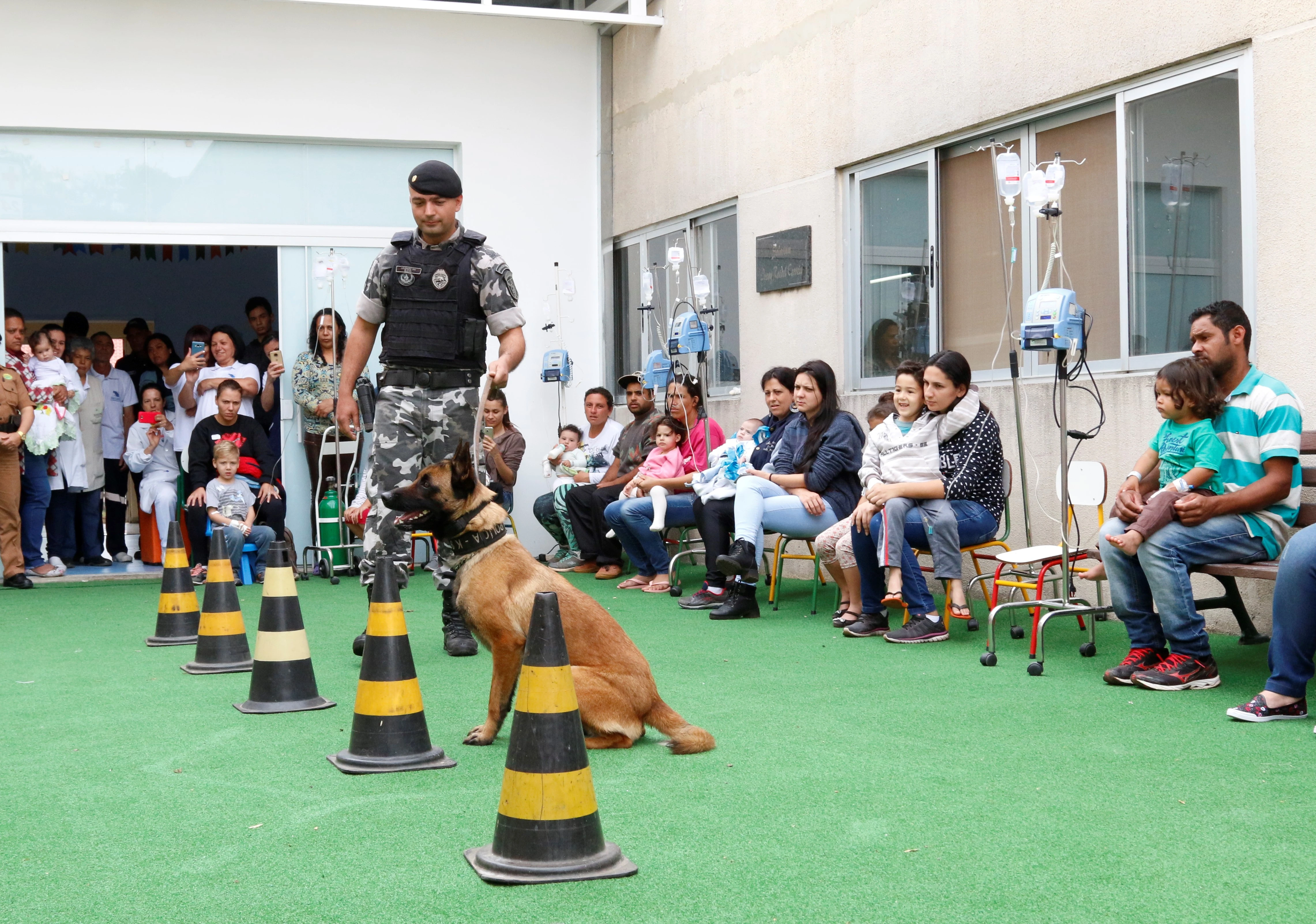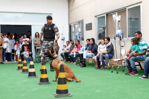 Para proporcionar descontração e alegria aos pequenos, enquanto tratam suas enfermidades, o evento foi realizado na área recreativa daquela unidade hospitalar, onde cães treinados e seus treinadores (Policiais Militares) conquistaram a atenção de todos os presentes.