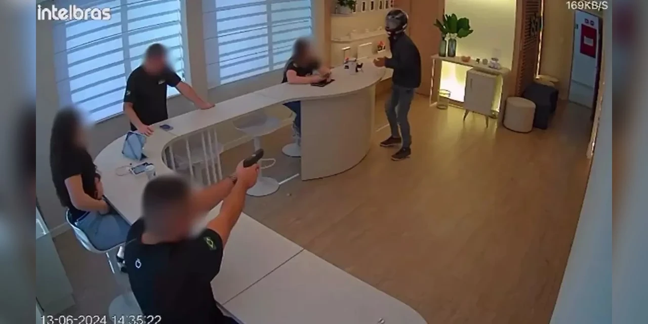 O momento da tentativa de assalto foi registrado pelas câmeras de segurança da loja. Na gravação é possível ver quatro trabalhadores no local. Em seguida, o suspeito acessa o local, se aproxima de uma vendedora e anuncia o crime. Logo depois, o proprietário reage e efetua os disparos.