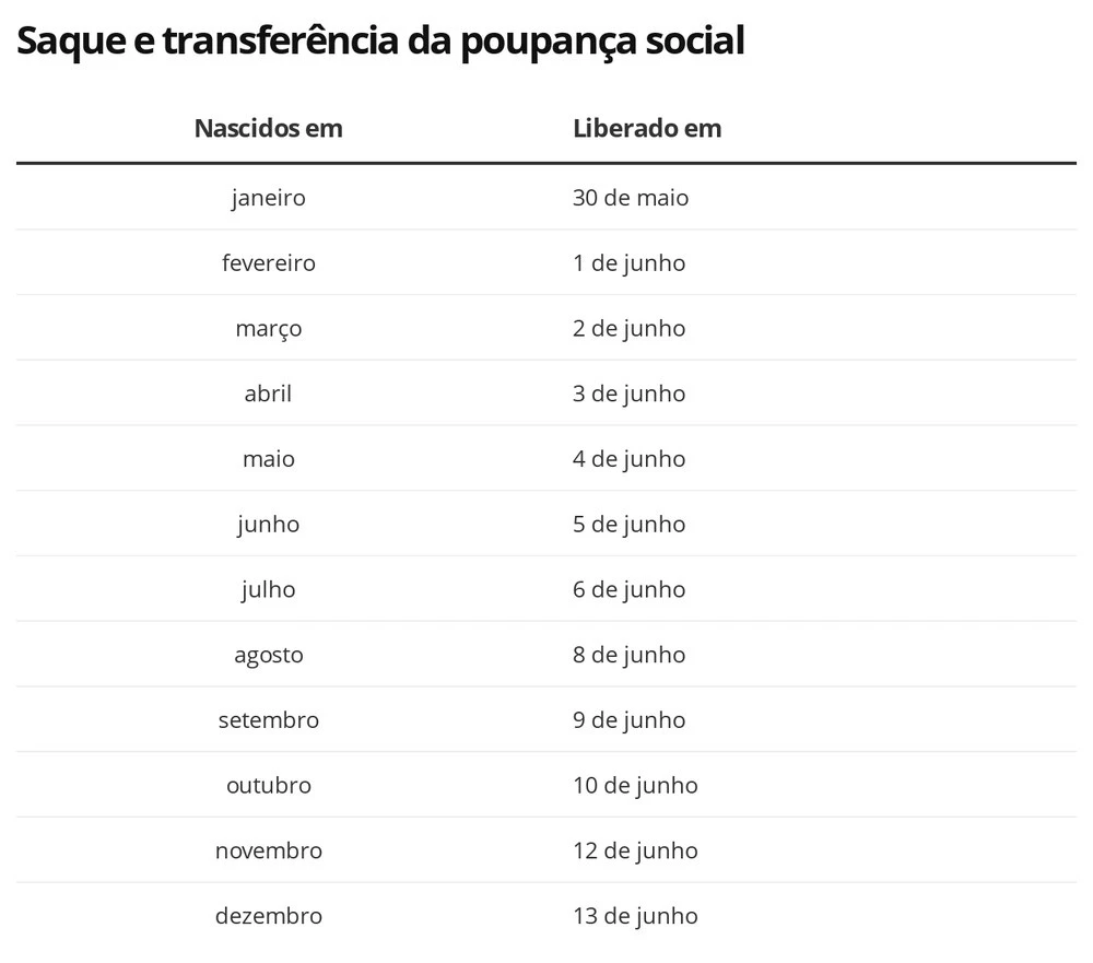 As liberações vão seguir um cronograma ligado ao mês de nascimento do trabalhador. Os primeiros a receber serão 2,6 milhões de beneficiários nascidos em janeiro. Até a data de liberação, os recursos já depositados nas poupanças podem ser usados apenas para pagamento de contas, de boletos e compras por meio do cartão de débito virtual.
