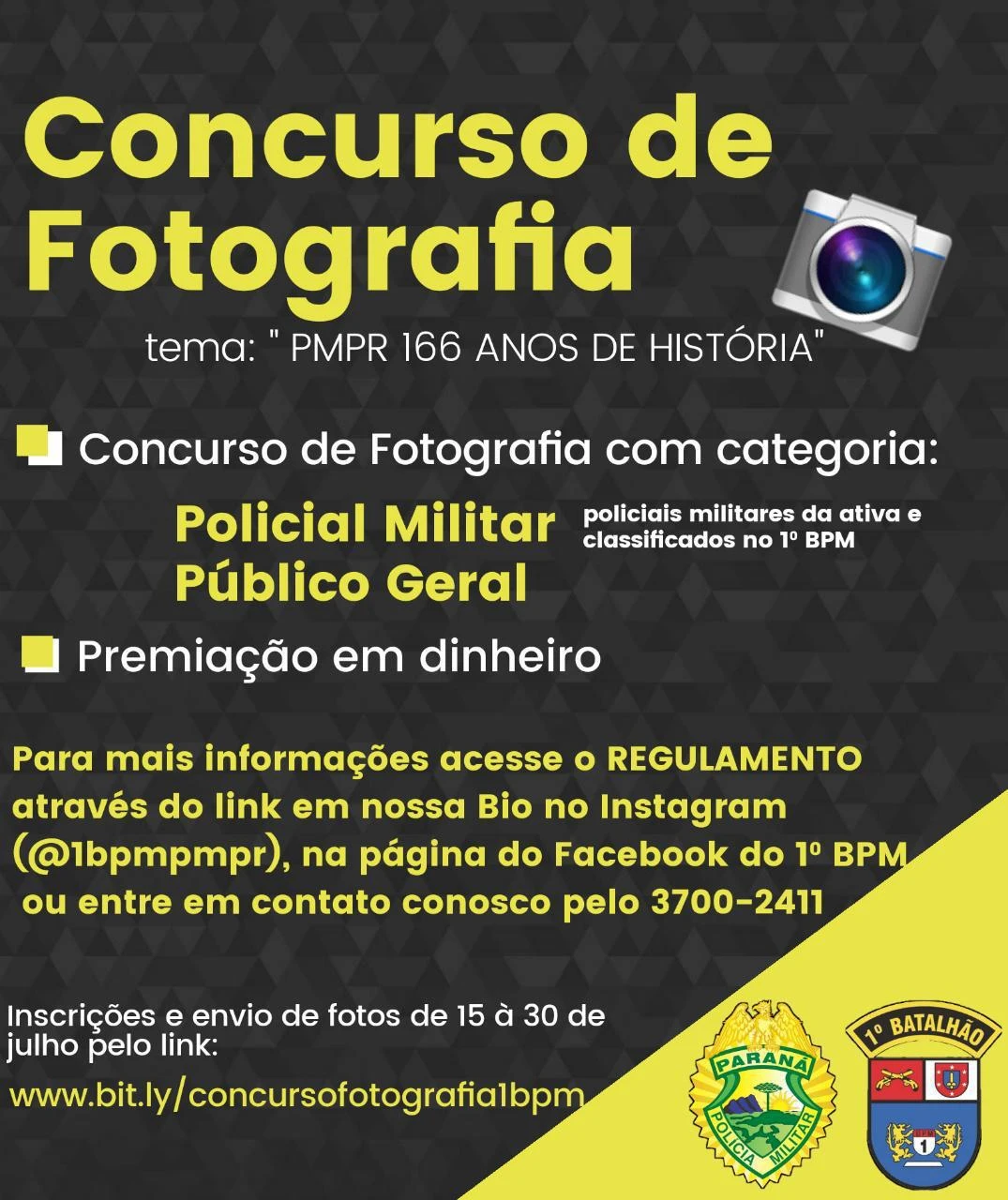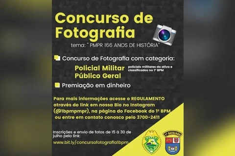 Para informações sobre o regulamento e inscrição do concurso é só acessar a página do Facebook do 1º BPM (1bpmpmr); Instagram (@1bpmpmpr) e através dos links