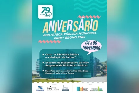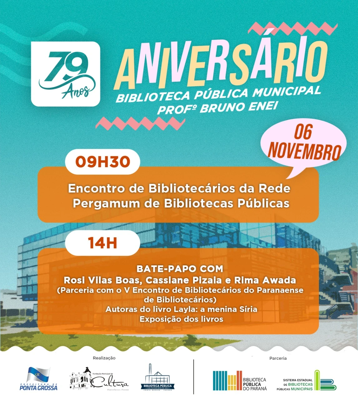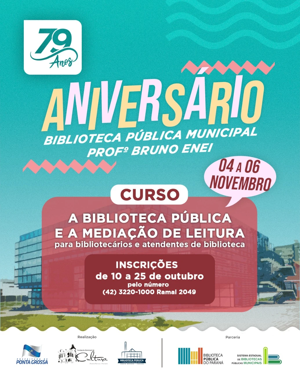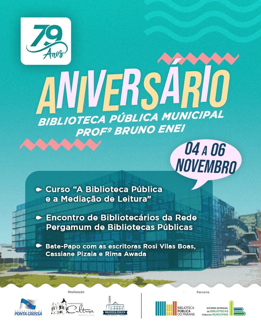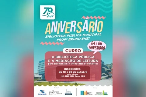 Luana Caroline Nascimento/Ponta Grossa - Na próxima semana, dos dias 04 a 06 de novembro, a Biblioteca Municipal Professor Bruno Enei realiza uma série de atividades em comemoração ao seu 79° aniversário. A programação inclui o curso “A Biblioteca Pública e a Mediação da Leitura”, que traz oficinas, bate-papos e rodas de leitura.