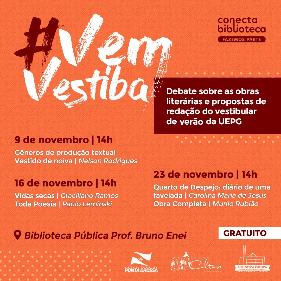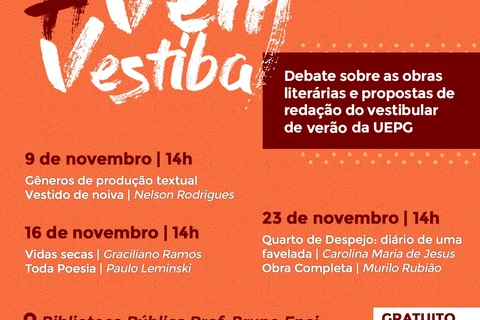 IMPRENSA/Ponta Grossa - Durante o mês de novembro a Biblioteca Pública Municipal Professor Bruno Enei, entidade mantida pela Prefeitura de Ponta Grossa, irá realizar uma nova edição do #VemVestiba. Ao todo serão três encontros na sede da Biblioteca para debater as obras cobradas no vestibular de verão da Universidade Estadual de Ponta Grossa (UEPG). As atividades serão às 14h com entrada gratuita e não necessita de inscrição prévia.