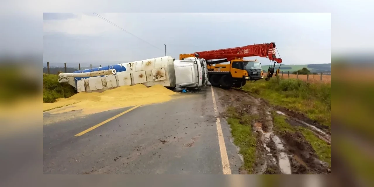 Um caminhão carregado com ração tombou e bloqueou a PR-438 no distrito de Guaragi, em Ponta Grossa, nos Campos Gerais do Paraná.