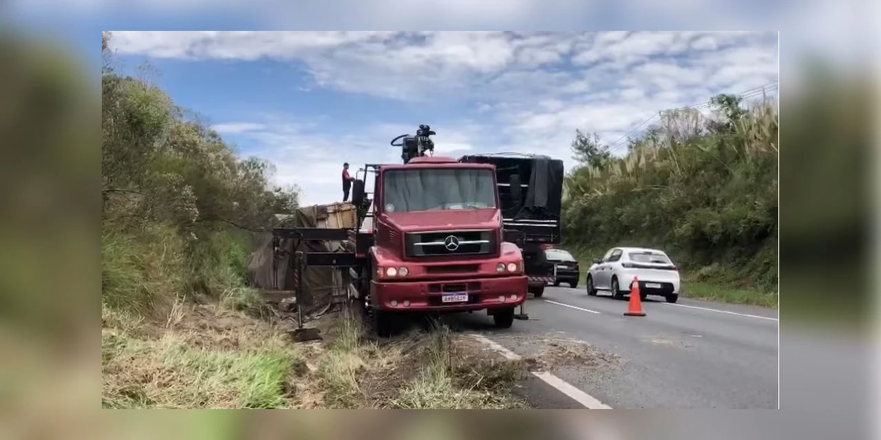 Segundo o caminhoneiro, o caminhão tombou após ele ser "fechado" por outro veículo e perder o controle da direção. O homem tem 30 anos e não se feriu.