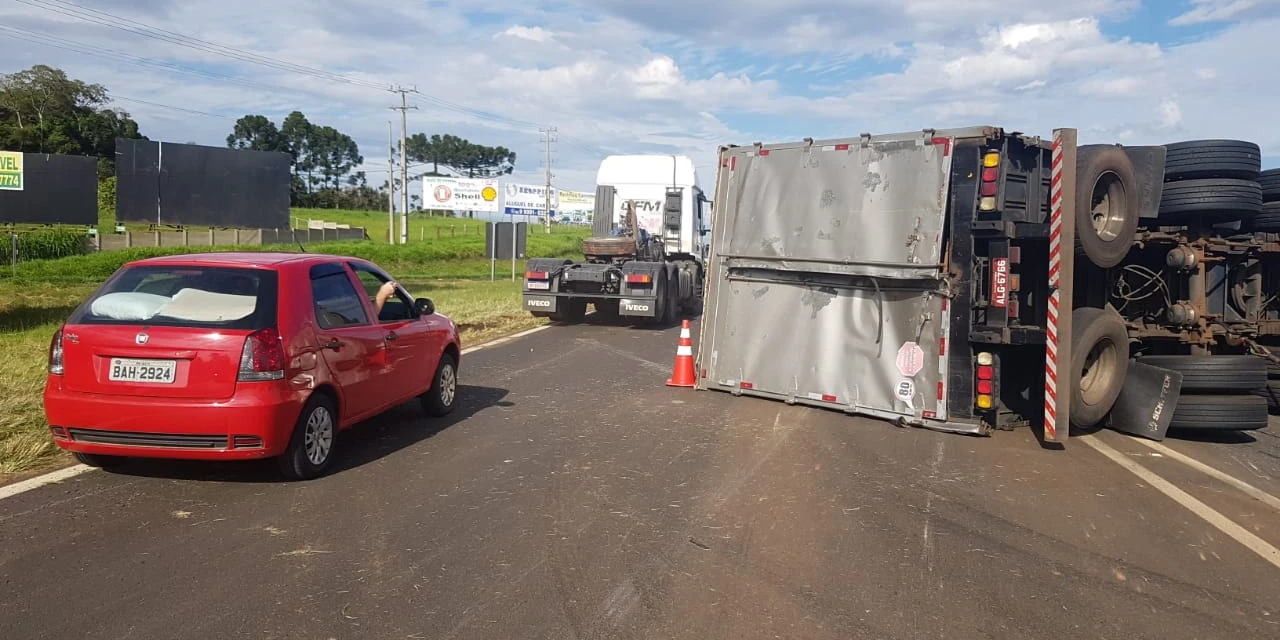 Para não atingir o veículo pequeno em cheio, o caminhoneiro desviou e acabou tombando o caminhão sobre a pista.