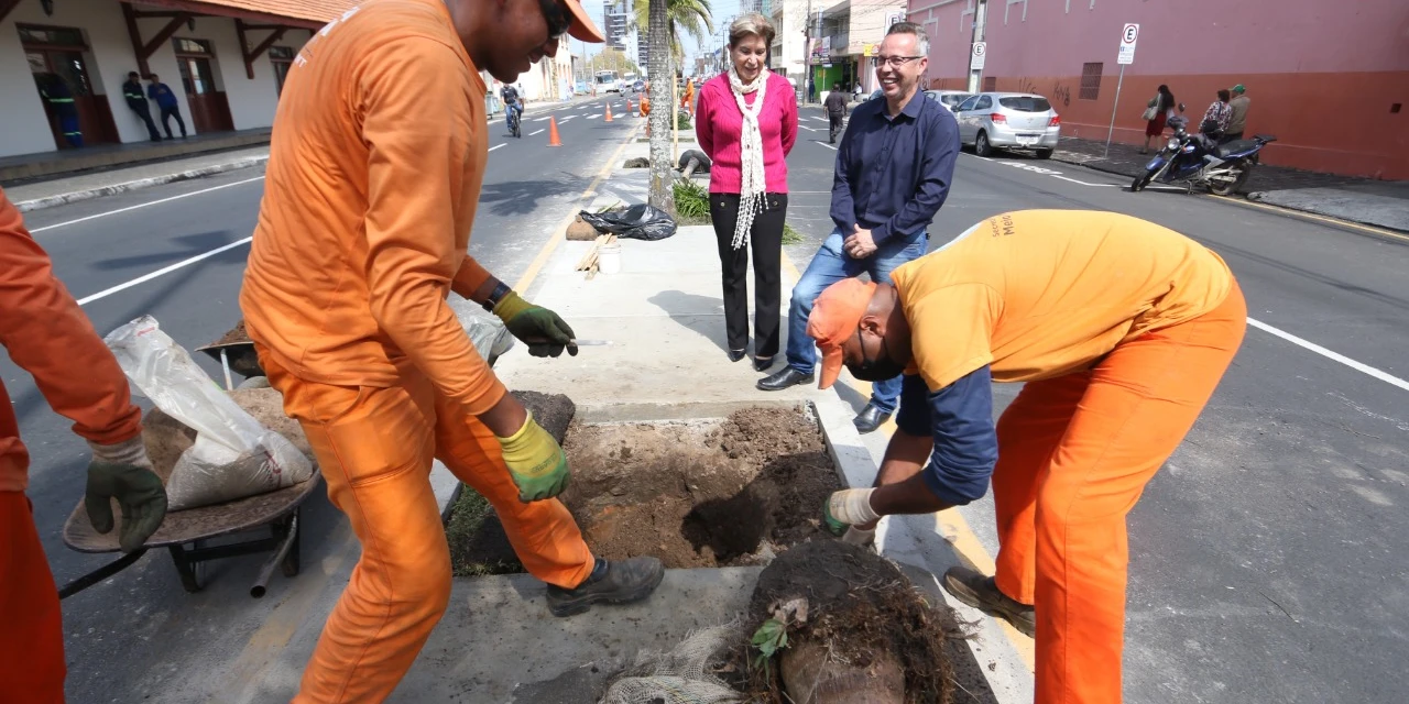 COM ASSESSORIAS - A Secretaria de Meio Ambiente fez nesta quinta-feira (25) o plantio de 15 palmeiras no canteiro central da Benjamin Constant, no centro da cidade. Os trabalhos de revitalização também incluíram a recuperação das calçadas, garantindo mais segurança na travessia de pedestres.
