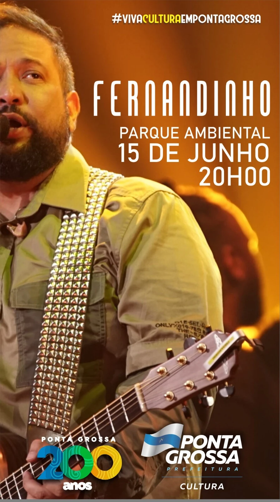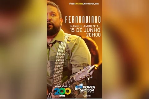 COM ASSESSORIAS - A Prefeitura de Ponta Grossa, através da Secretaria Municipal de Cultura, traz mais um grande show gratuito para a comunidade ponta-grossense. Depois do Ira! na abertura do Sexta às Seis, dia 12 de maio, agora é a vez do cantor gospel Fernandinho. Ele se apresenta no dia 15 de junho, a partir das 20 horas, no Parque Ambiental. A apresentação faz parte das comemorações dos 200 anos de Ponta Grossa e deve atrair, novamente, grande público.