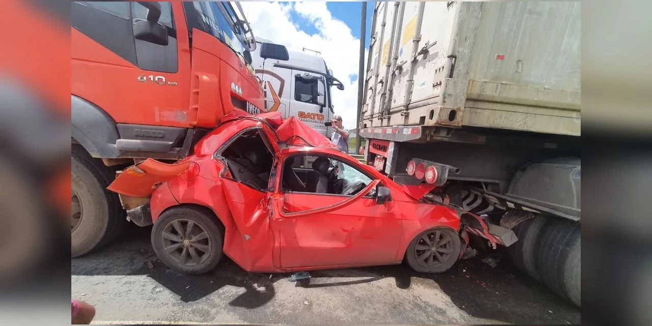 Um carro foi prensado entre dois caminhões na BR-376 em Ponta Grossa, nos Campos Gerais do Paraná, no fim da manhã desta sexta-feira (21). A família que estava dentro do veículo esmagado não se feriu.