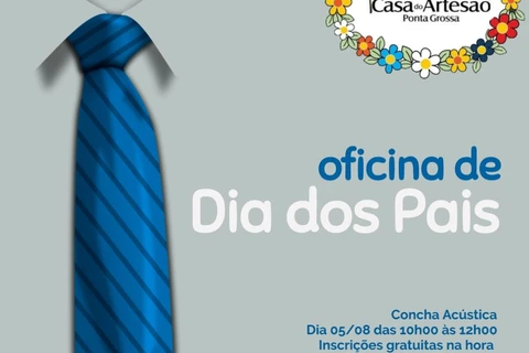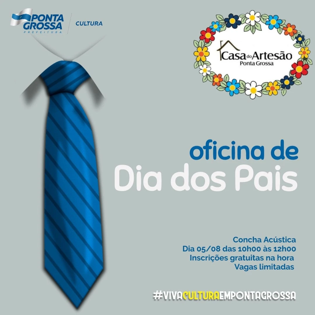COM ASSESSORIAS - A Casa do Artesão de Ponta Grossa realiza, no próximo sábado (dia 5), a 'Oficina de Dia dos Pais' de produção artesanal. A atividade acontece na Concha Acústica, das 10h às 12h. A promoção conta com apoio da Prefeitura de Ponta Grossa, através da Secretaria Municipal de Cultura. As inscrições são gratuitas e podem ser feitas no local e momentos antes do início. As vagas são limitadas.
