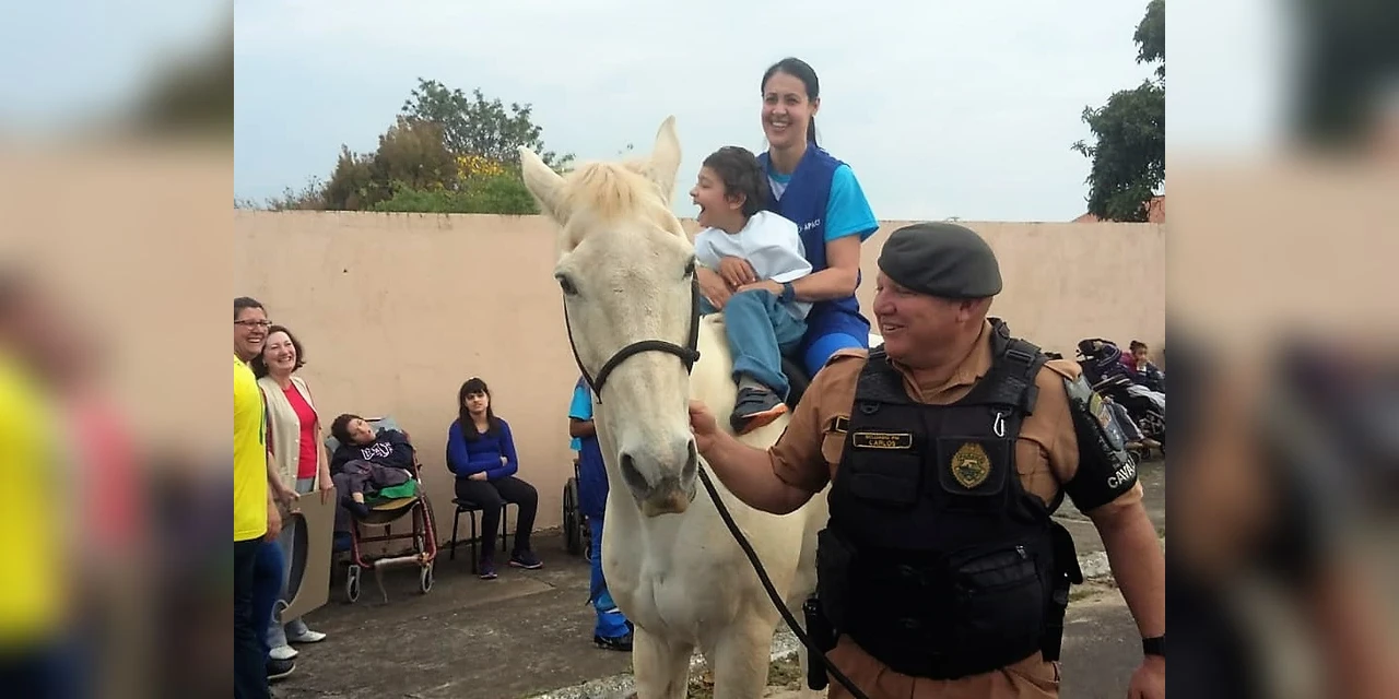 4º CRPM/1º BPM - Na manhã desta terça-feira (21/08), atendendo a um convite da Associação Pontagrossense de Assistência à Criança com Deficiência - APACD, o Pelotão de Polícia Montada do 1º Batalhão visitou a sede da instituição em Ponta Grossa/PR.