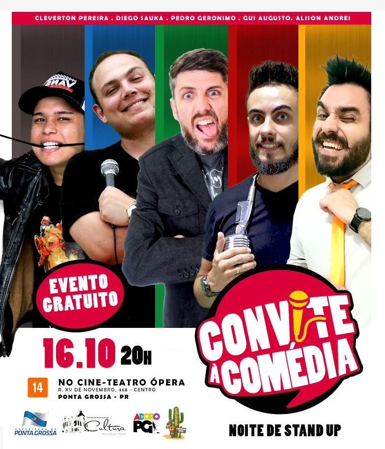 A proposta é dos comediantes Cleverton Pereira, Diego Saura, Gui Augusto, Pedro Gerônimo e Alisson Andrei e conta com o apoio da Fundação Municipal de Cultura. Cada apresentação da temporada do Convite à Comédia é única, pois o texto de cada comediante muda entre um show e outro, que acontecem duas vezes por mês. A agenda das próximas apresentações estará disponível no site da Prefeitura de Ponta Grossa (na aba ‘Agenda Cultural’) e no aplicativo Cultura Paraná.