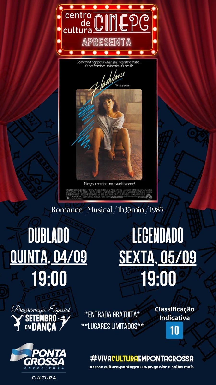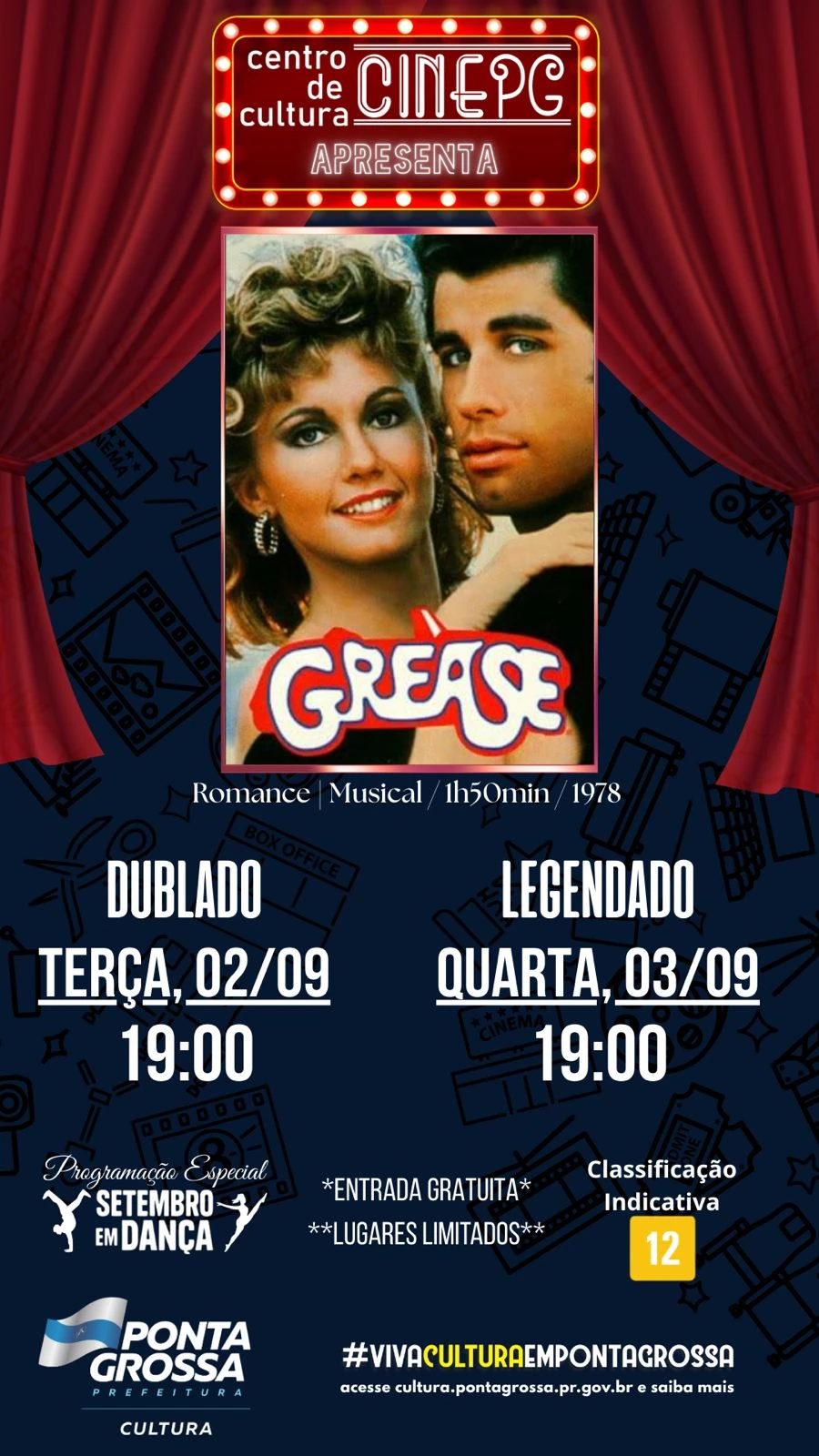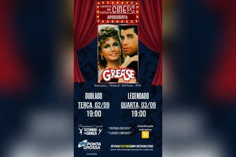 COM ASSESSORIAS - O CinePG traz nesta semana para o público ponta-grossenses dois musicais que marcaram época na história do cinema: Grease – Nos tempos da brilhantina, de 1978 (Terça e quarta); e Flashdance, de 1983 (Quinta e sexta). As sessões acontecem sempre a partir das 19 horas e a entrada é franca. A promoção é da Prefeitura de Ponta Grossa, através da Secretaria Municipal de Cultura.