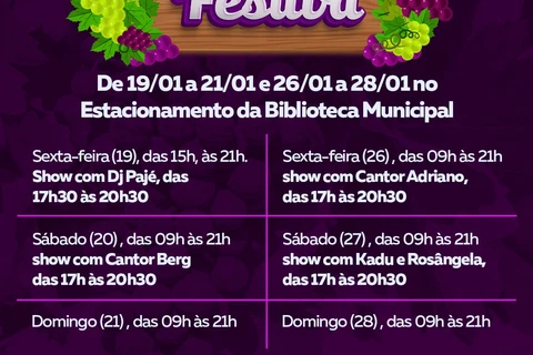 A Fesuva tem a participação de cinco produtores locais, que juntos devem colocar à disposição do público cerca de 30 toneladas de uvas das variedades Niágara Rosada, Niágara Branca, Uva Bordô e Preta, além de vinhos e sucos.