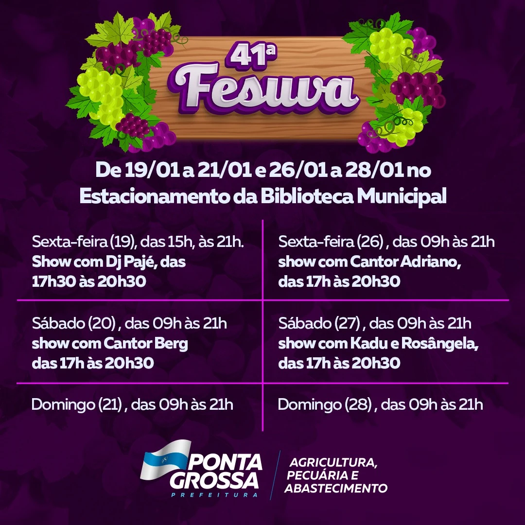 COM ASSESSORIAS - A Prefeitura de Ponta Grossa, através da Secretaria de Agricultura, Pecuária e Abastecimento, realiza a partir desta sexta-feira (19), às 15 horas, a 41ª edição da Fesuva, um dos mais tradicionais eventos do calendário local e que promete movimentar o pátio da Biblioteca Municipal nos dos próximos finais de semana (19, 20, 21 e 26, 27 e 28 de janeiro).
