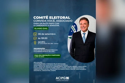 O bate-papo com Álvaro Dias será na sede da ACIPG (Comendador Miró, 860), a partir das 19h30, e os interessados em comparecer ao evento deverão fazer sua inscrição no