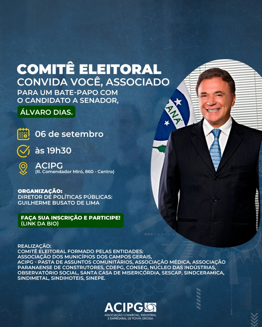 COM ASSESSORIAS - A Associação Comercial, Industrial e Empresarial de Ponta Grossa (ACIPG), ao lado de 14 entidades representativas da sociedade civil ponta-grossense, recebe na próxima terça-feira (06) o candidato ao Senado Álvaro Dias.