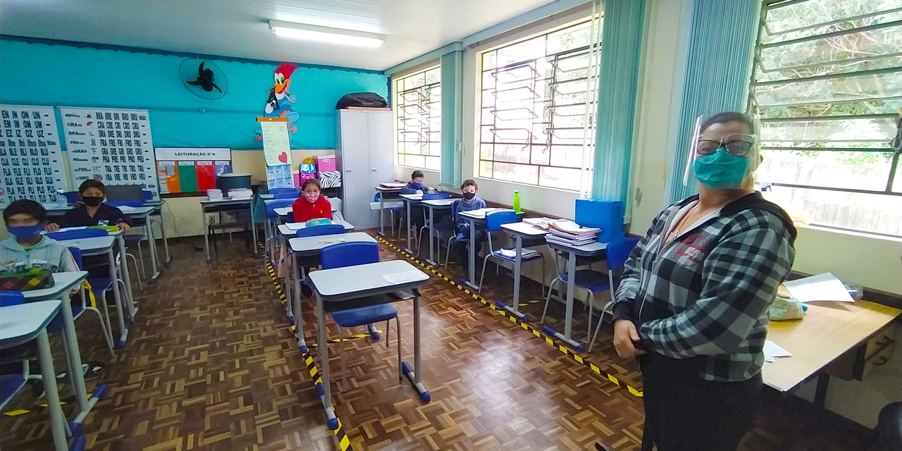 Todas as escolas e CMEIs da rede municipal de ensino possuem demarcações de distanciamento nos ambientes de convívio social, carteiras afastadas a 1,5 m de uma a outra nas salas de aula, refeitórios com assentos marcados, álcool em gel em todas as entradas e saídas, tapetes de higienização, entre vários outros cuidados que estão sendo seguidos diariamente.