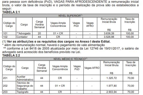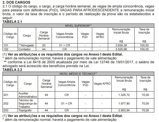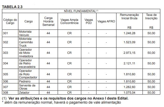 Os salários variam entre R$ 1.075,04 e R$ 3.636,39, e os cargos são: Advogado e Contador (nível superior); Auxiliar Administrativo, Técnico de Segurança do Trabalho e Topógrafo (nível médio e técnico); Motoristas de Veículo e Caminhão, Operadores de Moto Niveladora, Retroescavadeira e Rolo Compactador, Pedreiro, Servente de Obras e Zelador (nível fundamental).